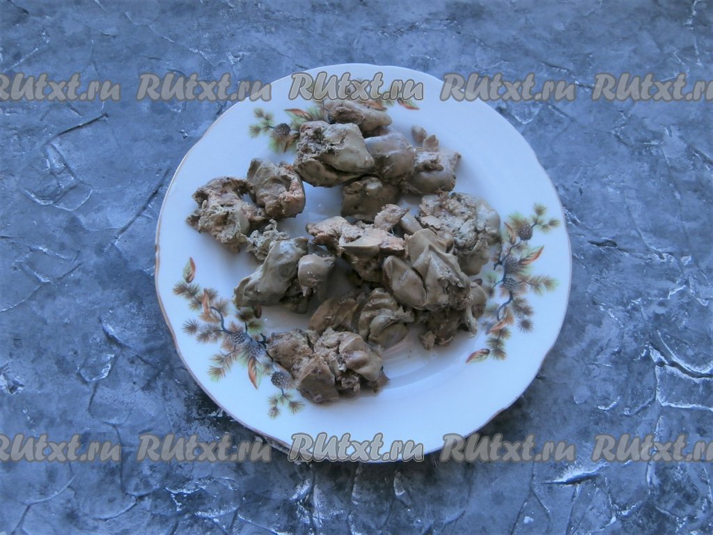 Печёнку нарезать небольшими кусочками в миску.