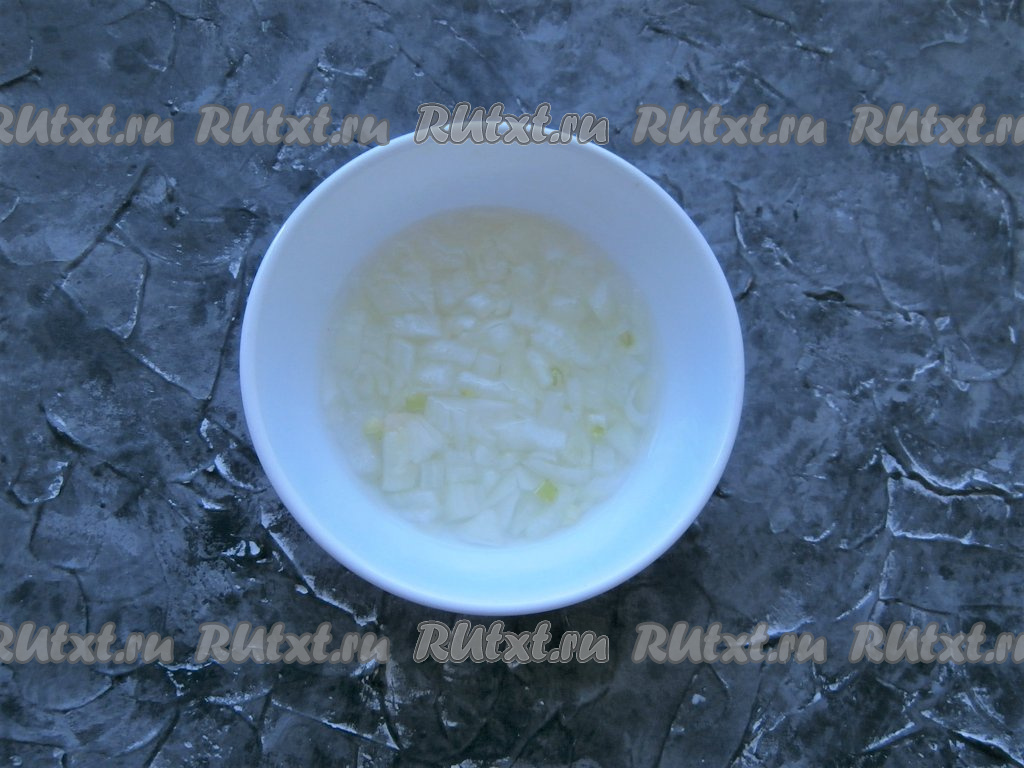 Приготовить маринад для лука из воды, уксуса, соли и сахара, добавить в него мелко нарезанный и очищенный репчатый лук. Оставить лук для маринования на 30 минут.