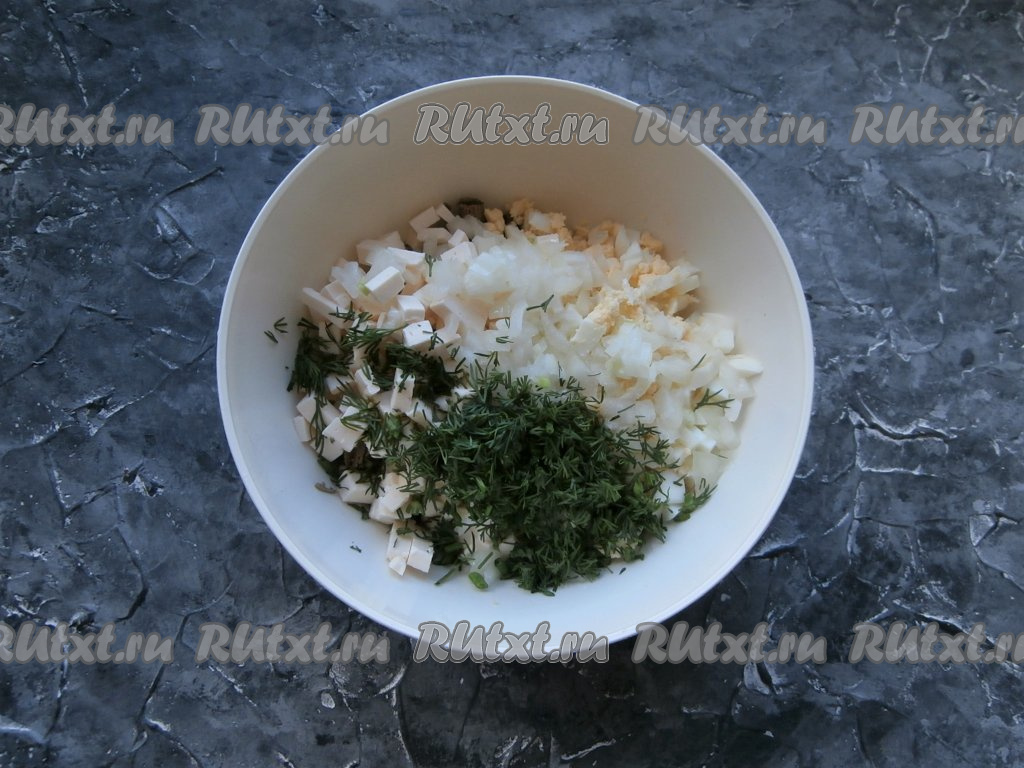 Сюда же положить измельчённый укроп и отжатый от маринада лук.