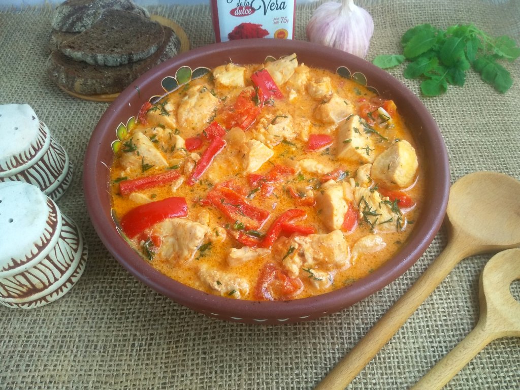 Готовое блюдо я перекладываю в глиняную посуду для сохранения тепла, а затем подаю к столу. Ароматный, аппетитный, вкусный, сытный паприкаш из курицы я подаю к столу, дополнив гарниром (например, картофелем, макаронами, рисом, гречкой и т.д.). Готовое блюдо можно хранить в холодильнике, разогревая по мере необходимости.