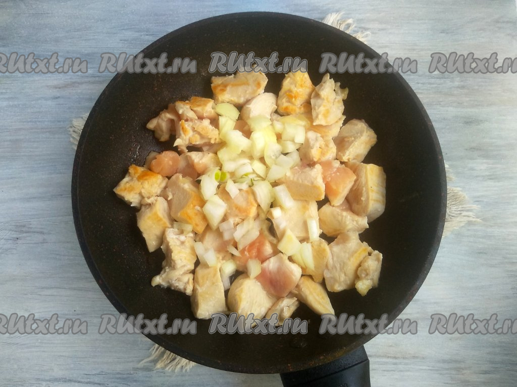 Очистить луковицу, мелко нарезать, а затем выложить к обжаренному куриному мясу. Обжаривать филе с луком 3-4 минуты, не забывая помешивать время от времени.