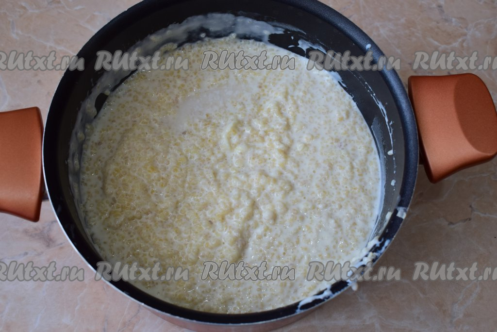 Молочная пшеничная каша пропарится и станет ещё более густой. Перемешайте кашу, разложите по тарелкам и угощайтесь.
