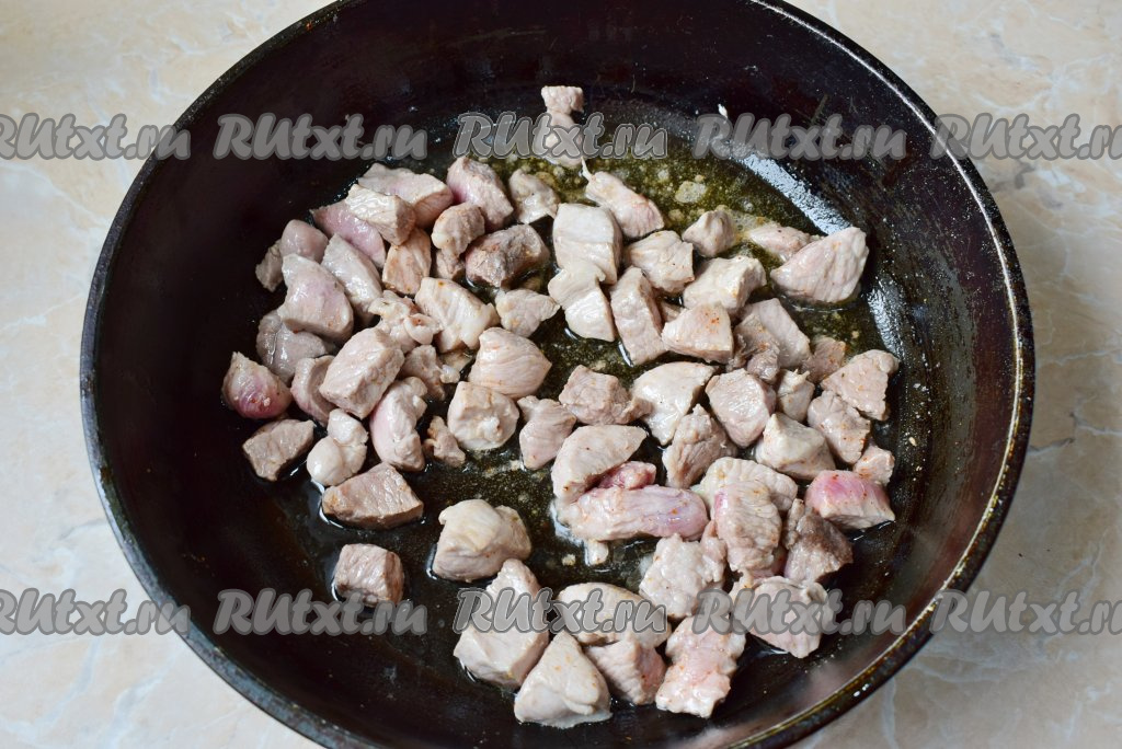 Для приготовления жаркого возьмите мясо свинины без костей, нарежьте его на небольшие кусочки. В горячую сковороду налейте немного растительного масла и обжарьте мясо на сильном огне в течение 3-5 минут, периодически помешивая.