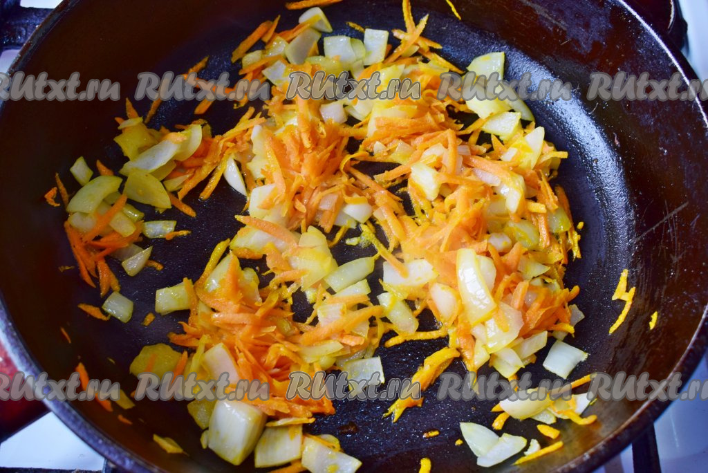 Очищенные лук и морковь измельчите любым удобным для вас способом (я морковку натёрла на тёрке, а лук нарезала на средние кубики) и обжарьте в течение 3-4 минут на среднем огне (до появления характерного аромата), посолите по вкусу.