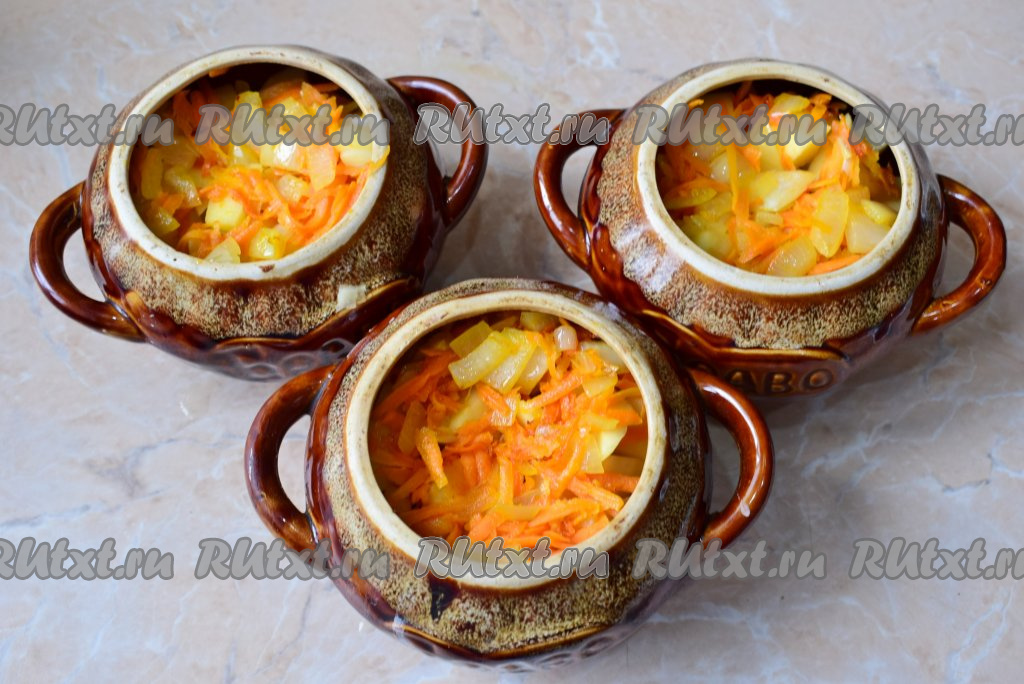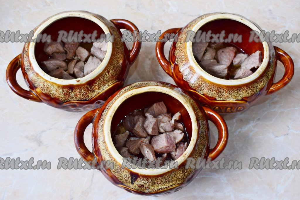 Обжаренное мясо разложите в керамические горшочки для запекания. Дополнительно смазывать горшочки ничем не надо. Немного подсолите мясо и добавьте специи.