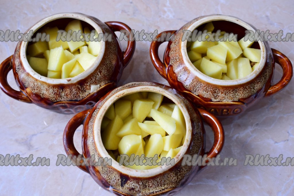 Картофель очистите, ополосните, нарежьте небольшими кусочками, посолите и сразу добавьте в горшочки.