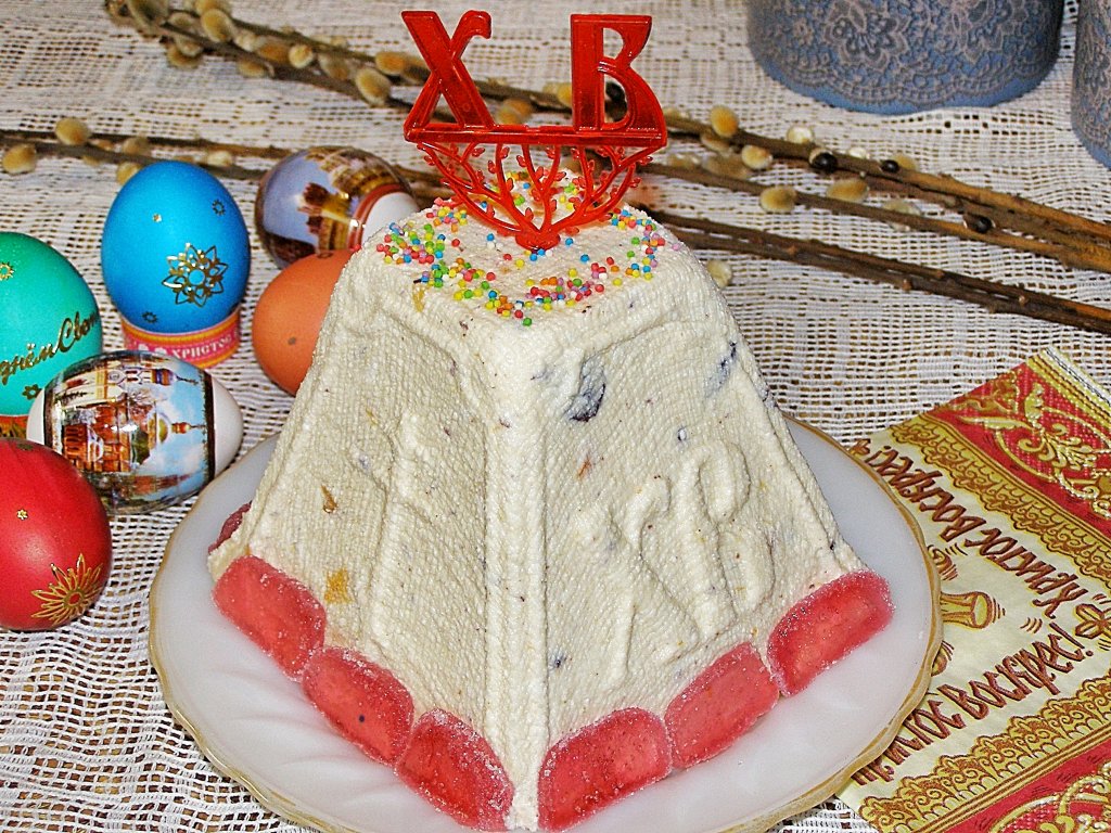 По истечении времени достаём пасху из холодильника, убираем груз, раскрываем края марли, накрываем тарелкой и переворачиваем. Аккуратно снимаем формочку, убираем марлю и украшаем на свой вкус. Ароматную, нежную и красивую заварную творожную пасху подаём к праздничному воскресному столу.