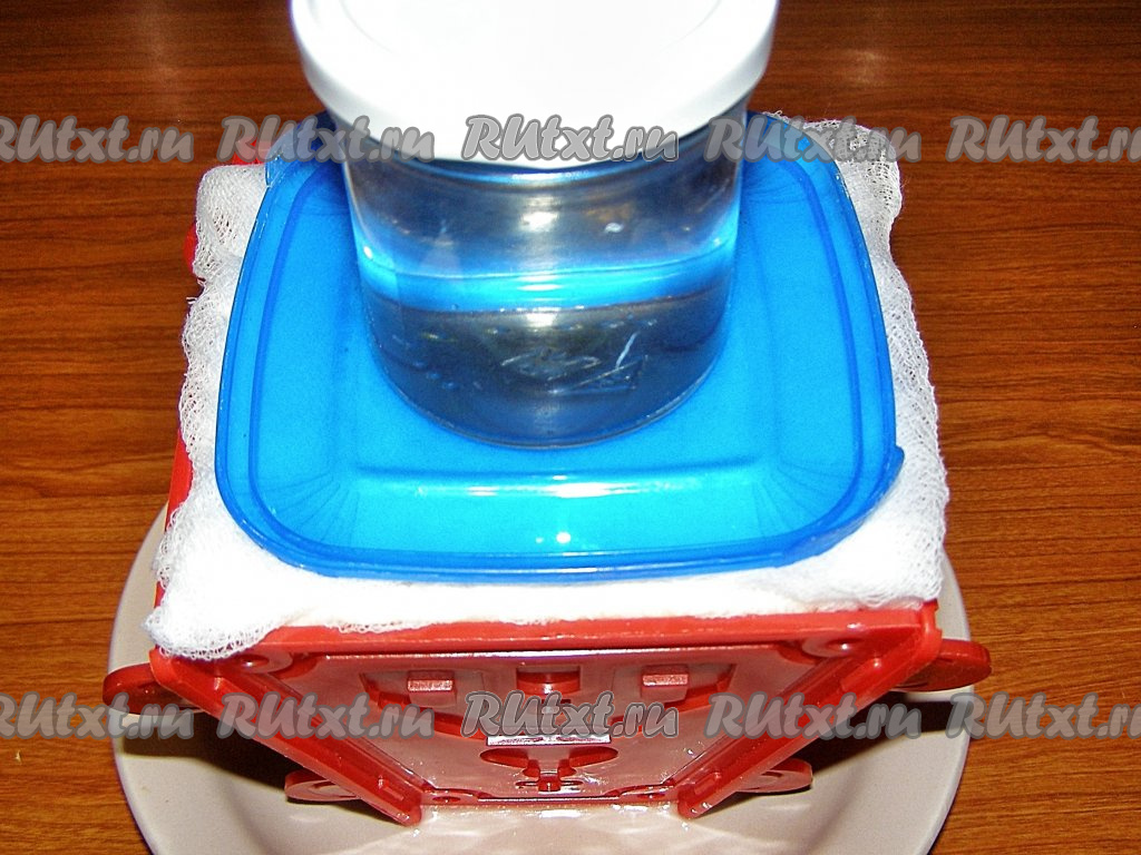 Через час ставим поверх формы с творожной заварной пасхой небольшой груз и убираем в холодильник на 12-14 часов. Сыворотку, которая будет стекать в тарелку, периодически нужно аккуратно сливать.
