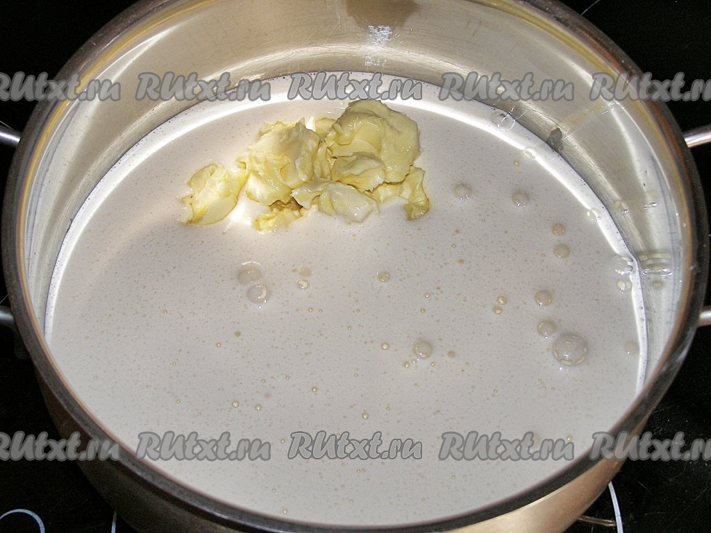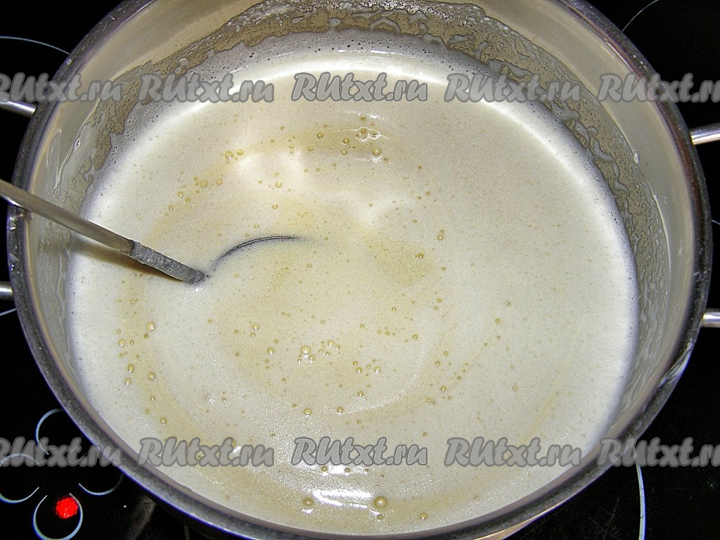 Ставим кастрюлю на средний огонь и, постоянно перемешивая, доводим практически до кипения. Как только масса начнёт немного густеть, убираем кастрюлю с огня и оставляем остыть до комнатной температуры. Чтобы творог остыл быстрее, кастрюлю можно поставить в таз с холодной водой. Когда творожная масса остынет, ставим её в холодильник, примерно, на 30 минут. За это время масса ещё сильнее загустеет.