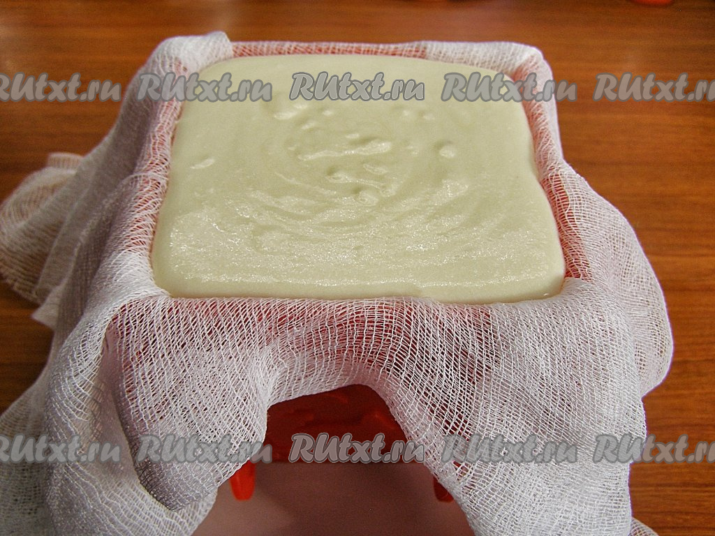 Формочку для пасхи ставим на тарелку вверх дном, выстилаем двумя слоями марли. Концы марли должны свисать с краёв формы. Выкладываем творожную массу в формочку для пасхи. Закрываем верх свисающими краями марли и убираем в холодильник, примерно, на час. На тарелку, на которой стоит формочка, будет стекать сыворотка, которую нужно аккуратно слить.
