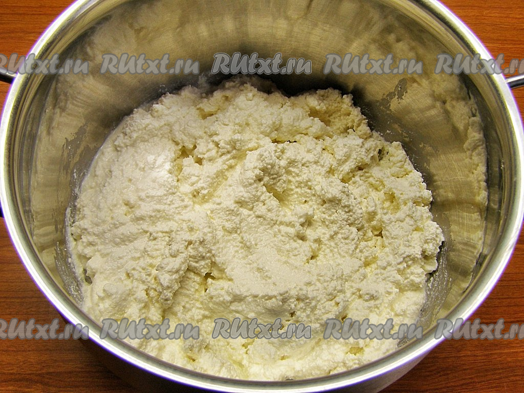 Получившуюся яично-сахарную массу перекладываем к протёртому творогу, добавляем размягчённое сливочное масло (по желанию, масло можно нарезать на кусочки) и сметану.