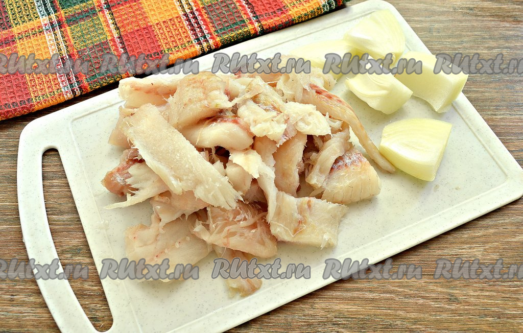 Удалить хребтовую кость и мелкие косточки. Разделать тушку минтая на филе. А затем рыбное филе нарезать на кусочки для дальнейшего измельчения в мясорубке. Очистить половинку лука, нарезать его крупными дольками.
