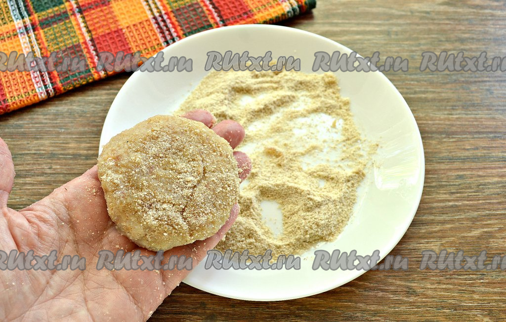 Из рыбного фарша сформировать котлеты и обвалять их в панировочных сухарях. У меня вышло 5 штук.