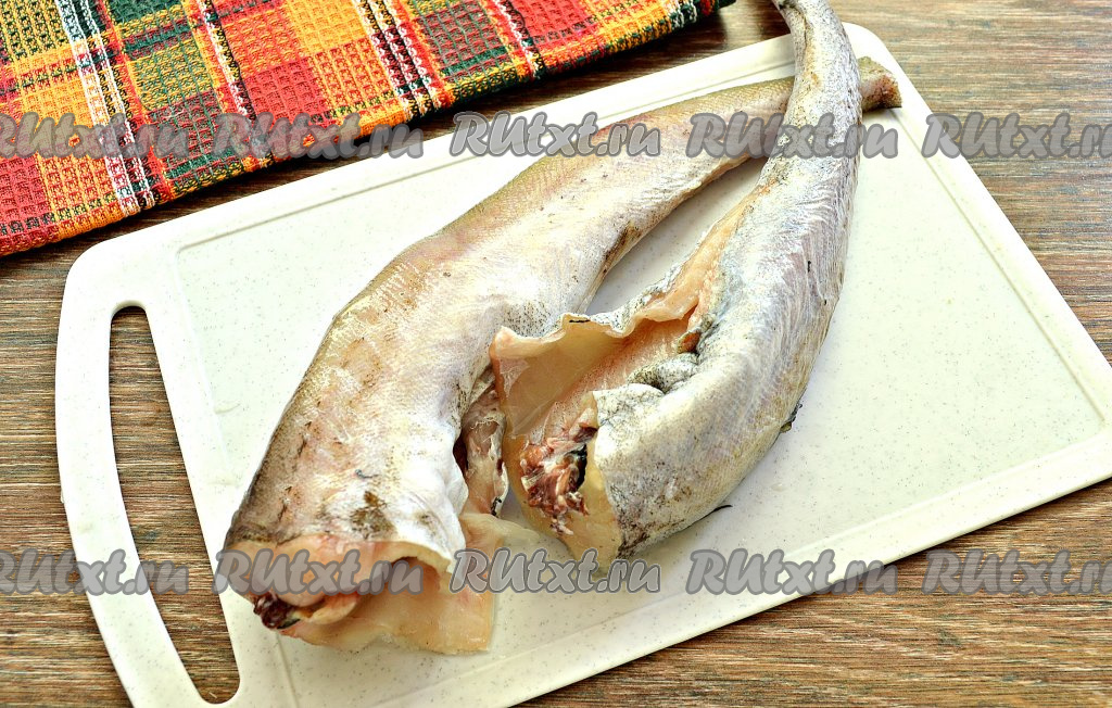 Минтая разморозить, срезать плавники и хвост, удалить внутренности. Обязательно избавиться от чёрной плёнки внутри рыбы.