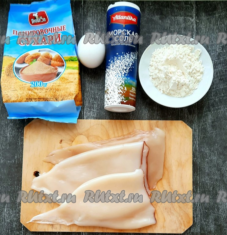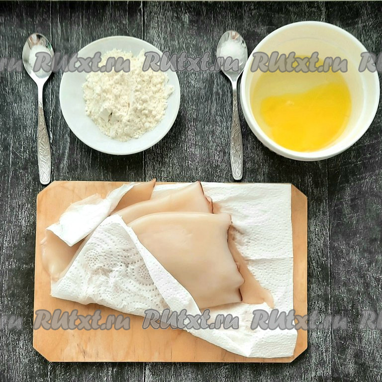 Промакнуть кальмаров бумажными салфетками, чтобы убрать лишнюю влагу. Муку насыпать в тарелку, добавить 1/2 чайной ложки соли, хорошо перемешать. Яйцо разбить в другую ёмкость и немного взбить вилкой, добавив 1/2 чайной ложки соли, яичный кляр готов.
