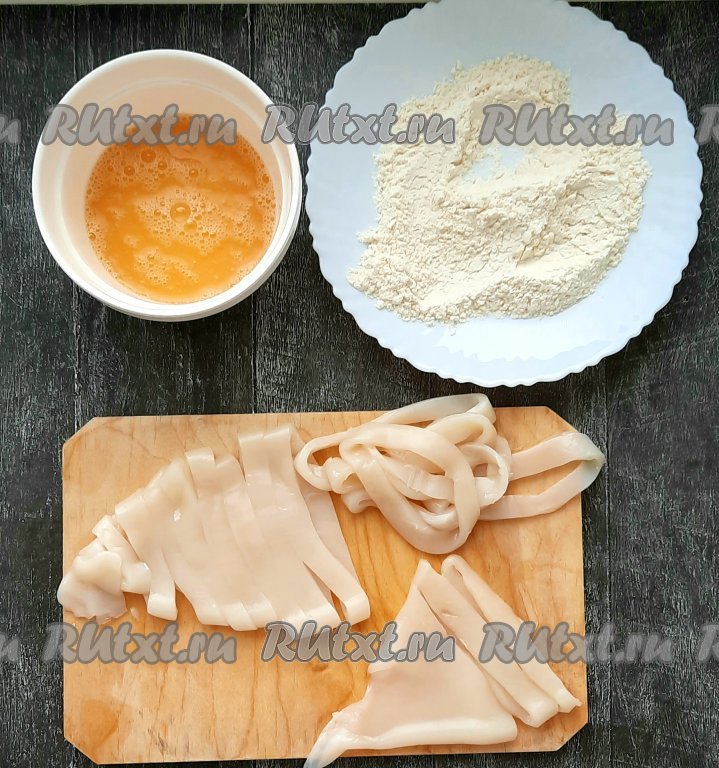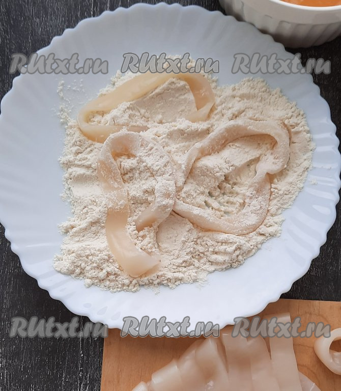 Нарезать очищенные тушки кальмаров на кольца одинаковой ширины. Ширина каждого колечка, примерно, 1 сантиметр. Тщательно обвалять каждое колечко в муке, смешанной с солью, чтобы все участки покрылись мукой.