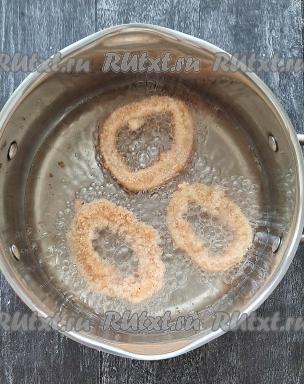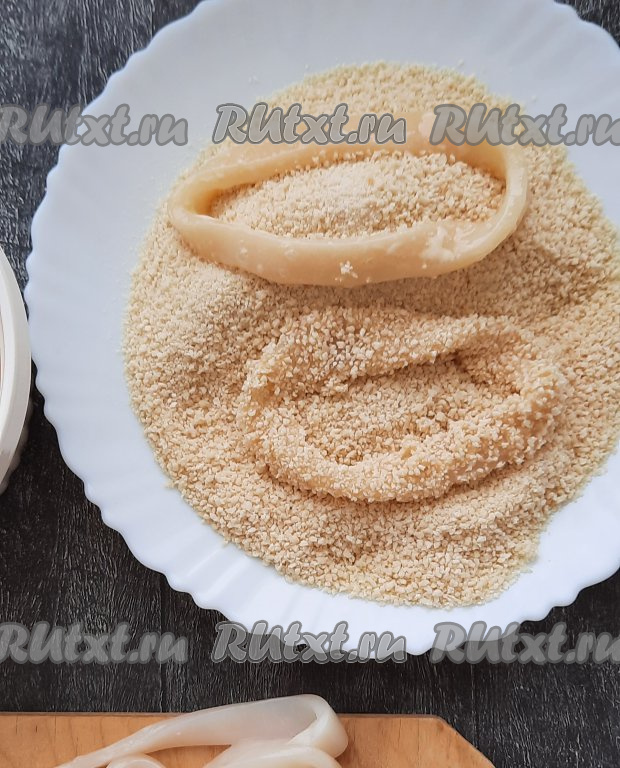 Далее каждое кольцо кальмара обвалять в панировочных сухарях со всех сторон так, чтобы колечки были полностью покрыты сухарями.