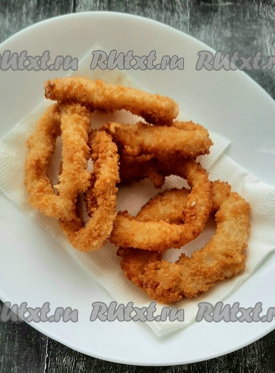В тарелку положить несколько бумажных салфеток, выкладывать готовые кольца на салфетки, чтобы впиталось лишнее масло. Постепенно пожарить все колечки.