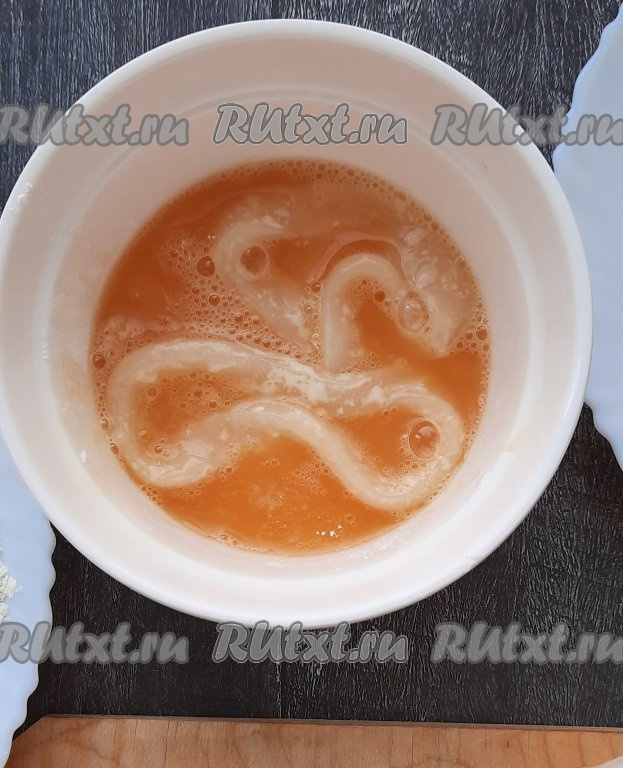 После того как обваляли колечки в муке, необходимо обмакнуть их полностью в яичный кляр.