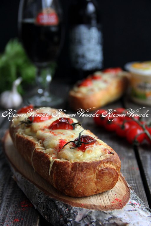Срезать верхушку багета и выбрать мякиш. Я разрезала длинный багет на две части. Получились вот такие две лодочки.