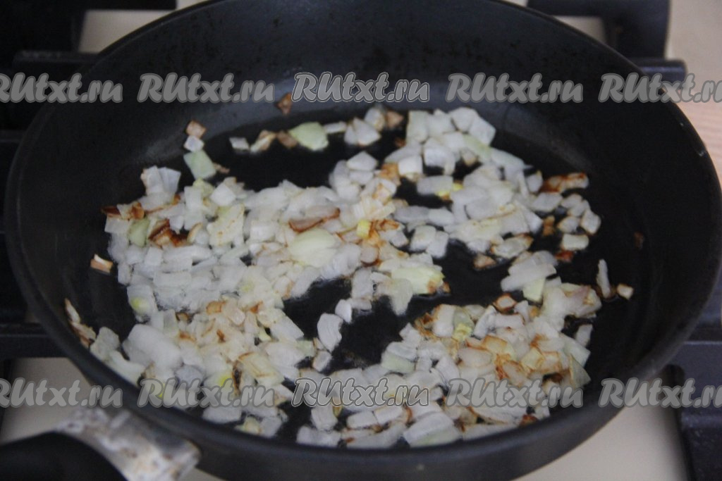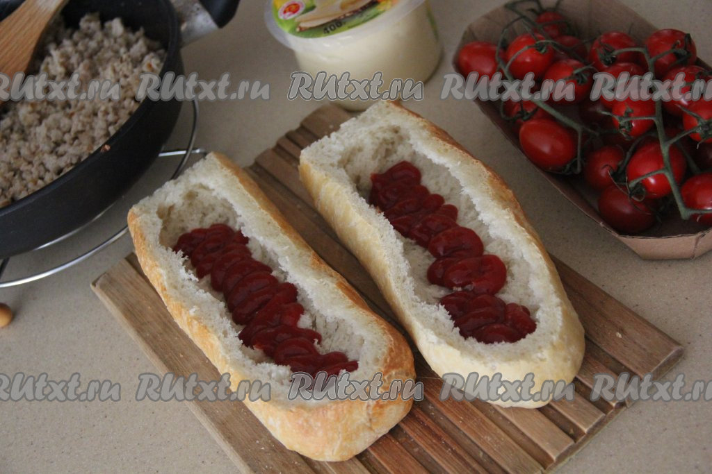 Лук почистить, мелко нарезать и обжарить на сковороде на подсолнечном масле на умеренном огне до золотистости (в течение 3-5 минут), иногда помешивая. Затем добавить к луку фарш и обжарить до готовности (в течение 10-15 минут), периодически разбивая комочки мяса. Фарш с луком немного подсолить, учитывая, что багет будет запекаться с добавлением кетчупа, в состав которого входит соль. Затем снять с огня и дать фаршу немного остыть.