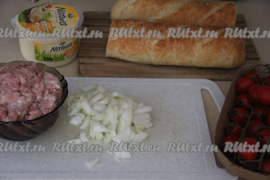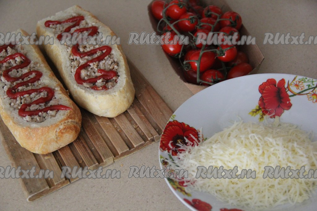Фаршированный багет, запечённый в духовке, можно приготовить для перекуса. В роли начинки можно использовать ветчину, колбасу, сыр или мясной фарш. Я решила приготовить багет с начинкой из фарша и сыра, получилось очень вкусно, сочно, сытно и довольно просто. Чтобы начинка была более сочной, я добавила томатный кетчуп, а помидорами черри украсила верхушку.