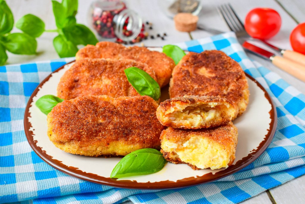 Сочные, вкусные, румяные рыбные котлеты, приготовленные с добавлением плавленного сыра, дополните гарниром и горячими подавайте к столу.