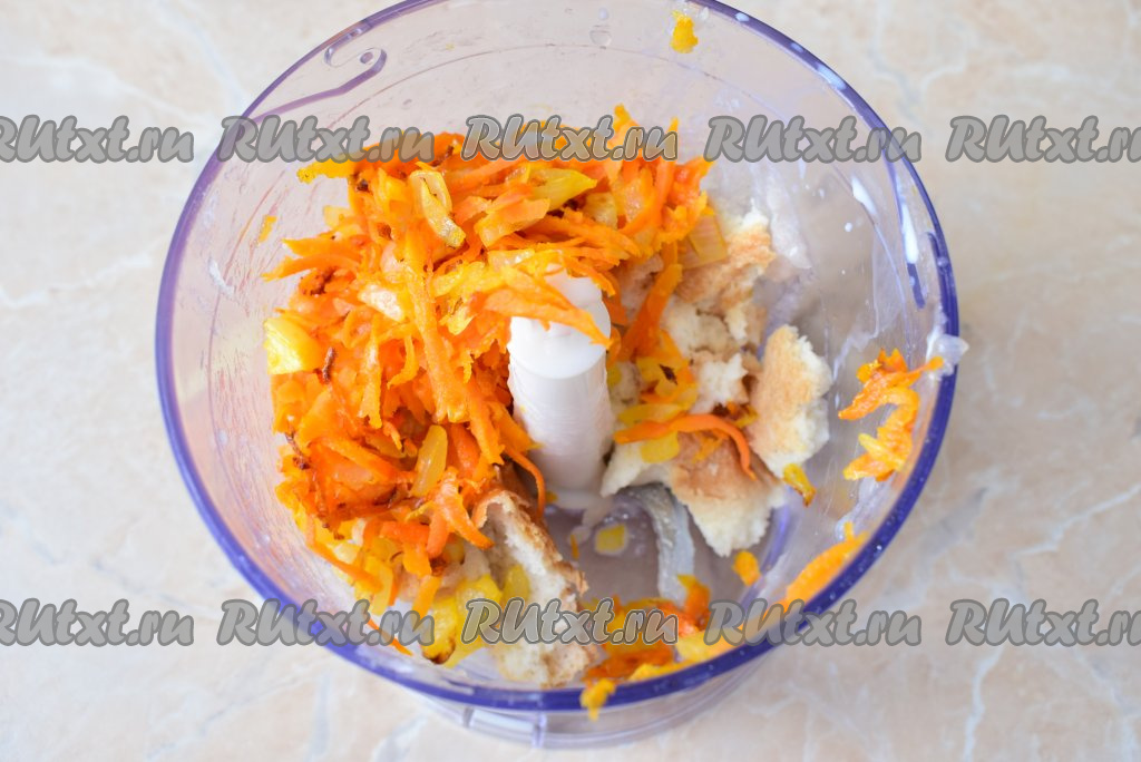 Батон отожмите от молока и выложите в измельчитель вместе с обжаренными морковкой и луком, превратите в однородную массу (если используете мясорубку, то пропустите овощи и батон через неё) и переложите в чашу к рыбе с сыром.