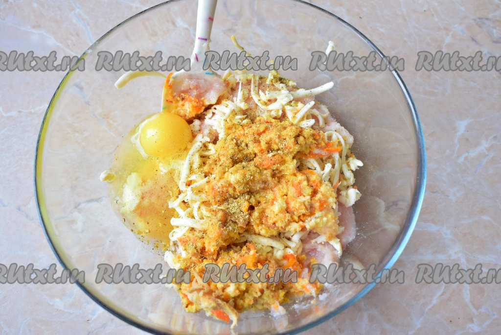 Добавьте в чашу с фаршем яйцо, соль и специи по вкусу, перемешайте.