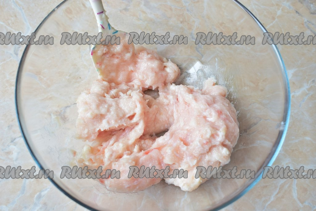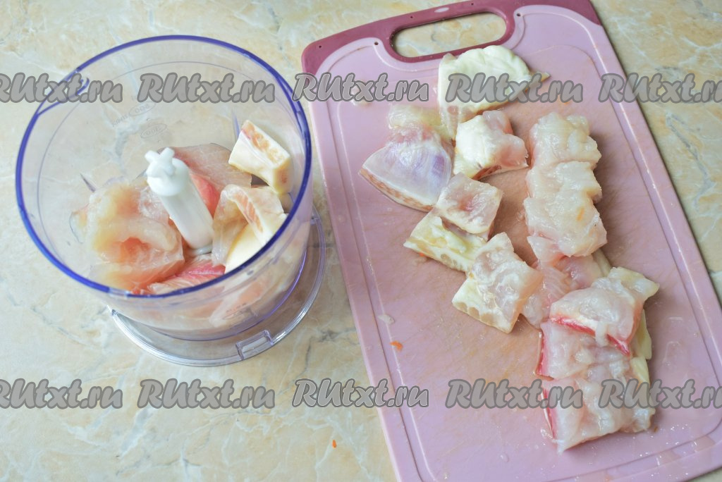 Рыбное филе нарежьте на кусочки и измельчите его в фарш. Для получения фарша филе рыбы можно прокрутить через мясорубку или воспользоваться измельчителем (рыбное филе очень нежное, поэтому измельчитель с лёгкостью справится с этой задачей).