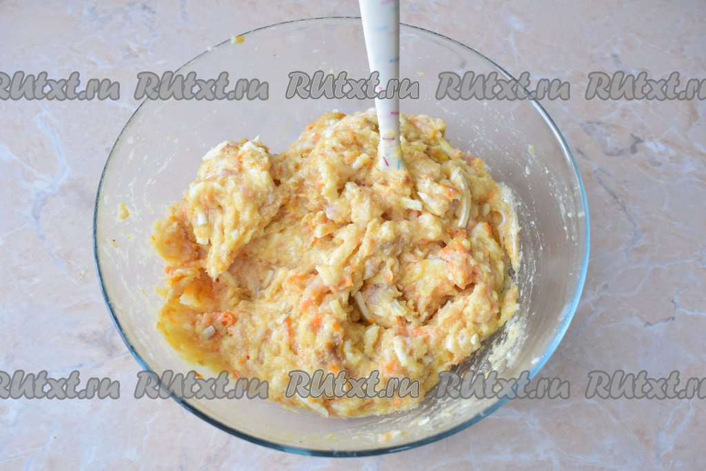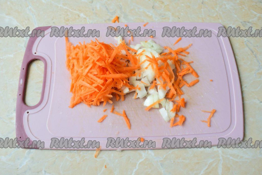 Лук и морковь очистите, затем морковку натрите на тёрке, а луковицу нарежьте на средние кубики. Обжарьте лук и морковь на небольшом количестве растительного масла на среднем огне до мягкости (ориентировочно, вам потребуется около 5 минут). В процессе обжаривания не забывайте иногда перемешивать овощи, чтобы они не подгорели. Когда обжаренные морковь с луком станут мягкими, уберите их с огня и дайте им остыть.