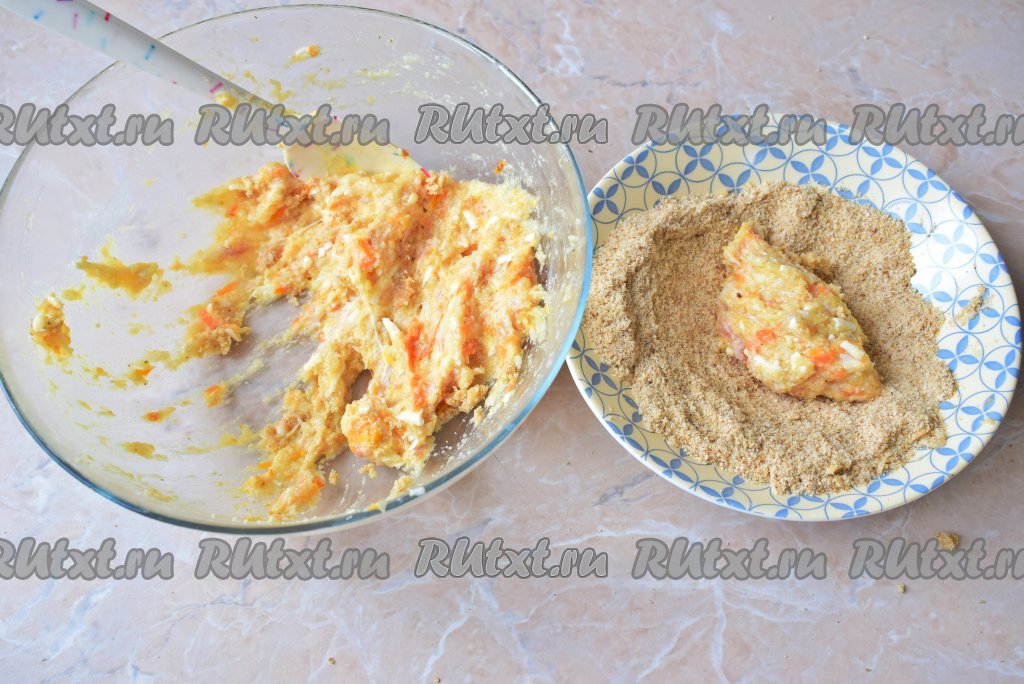 Берите немного рыбного фарша, формируйте котлеты и полностью обваливайте их в панировочных сухарях.