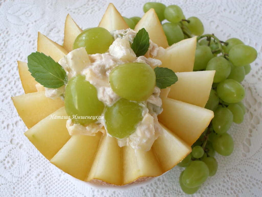 Выложить фруктовый салат с курицей в дыню, украсить виноградом, листочками мяты и подавать.