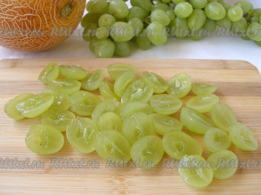 Виноград вымыть, разрезать пополам, вынуть косточки.