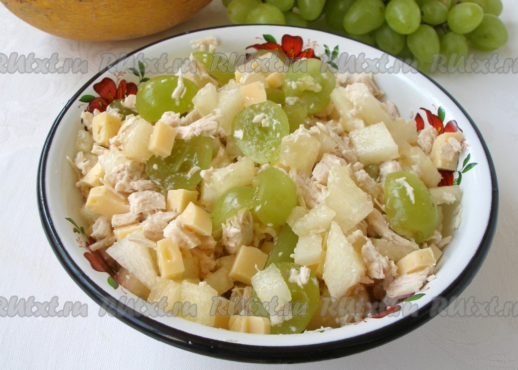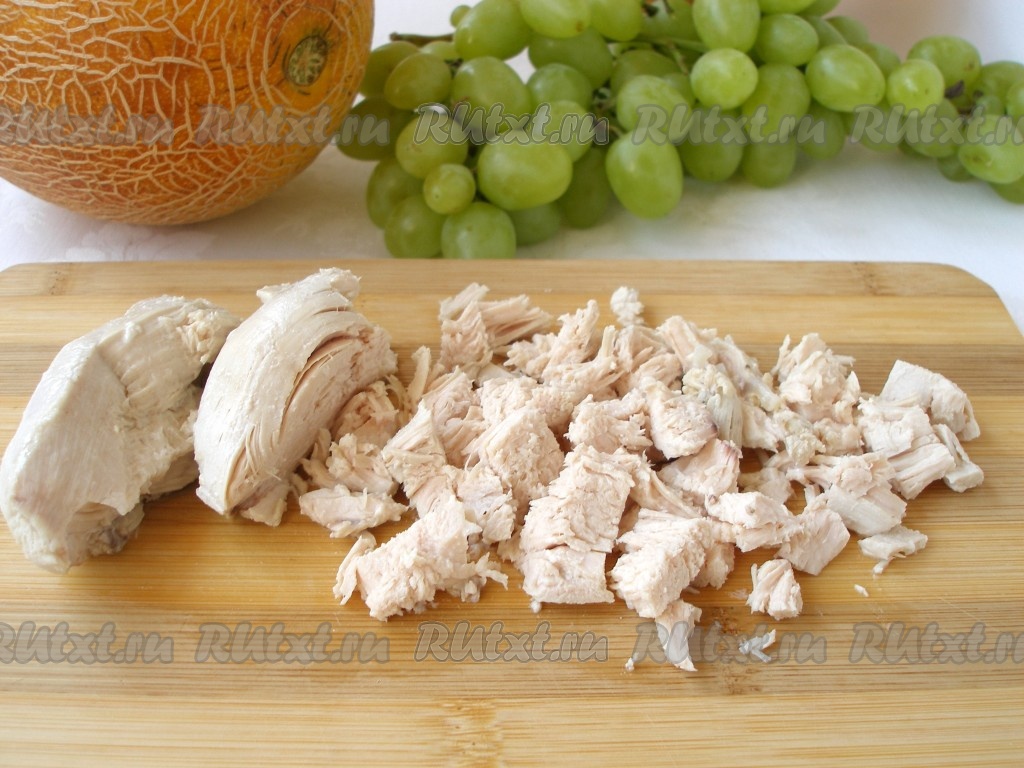 Виноград, дыню, сыр, курицу аккуратно перемешать, заправить салат йогуртом. Вкусный, сочный салат с дыней и курицей готов.