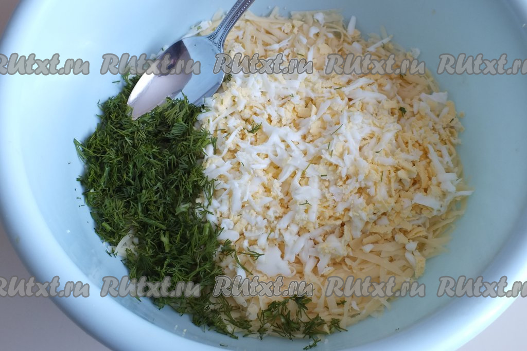 Пока тесто подходит, сделайте начинку. Для этого отварите 2 яйца в течение 8-9 минут с начала кипения воды, затем полностью остудите и очистите. Вымойте и обсушите, а затем мелко нарежьте укроп. В миску на крупной тёрке натрите яйца и сыр, добавьте укроп.