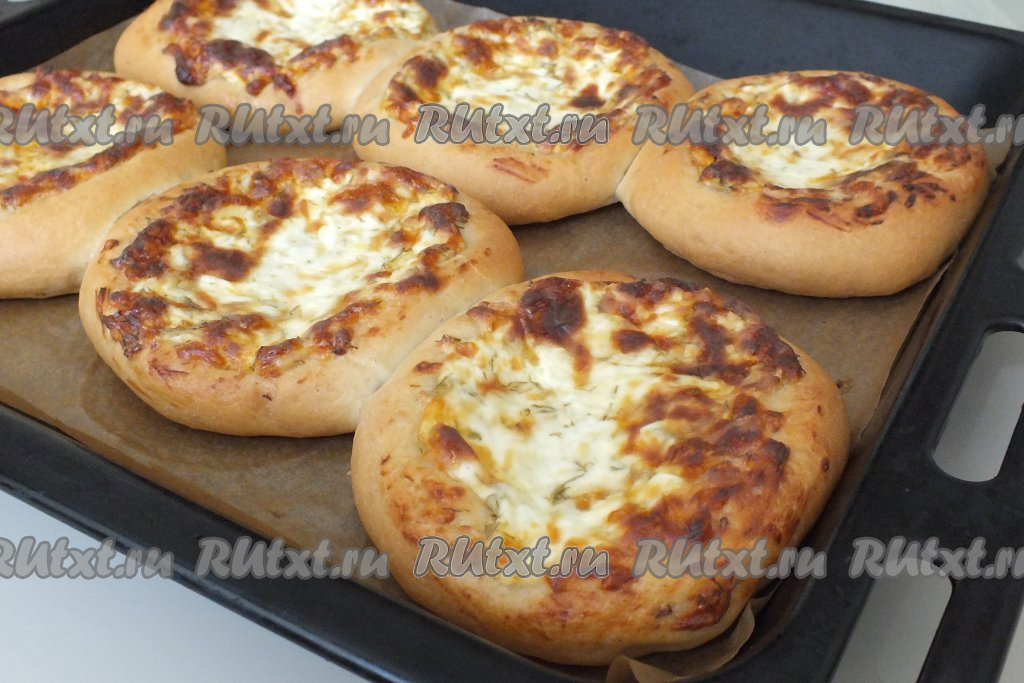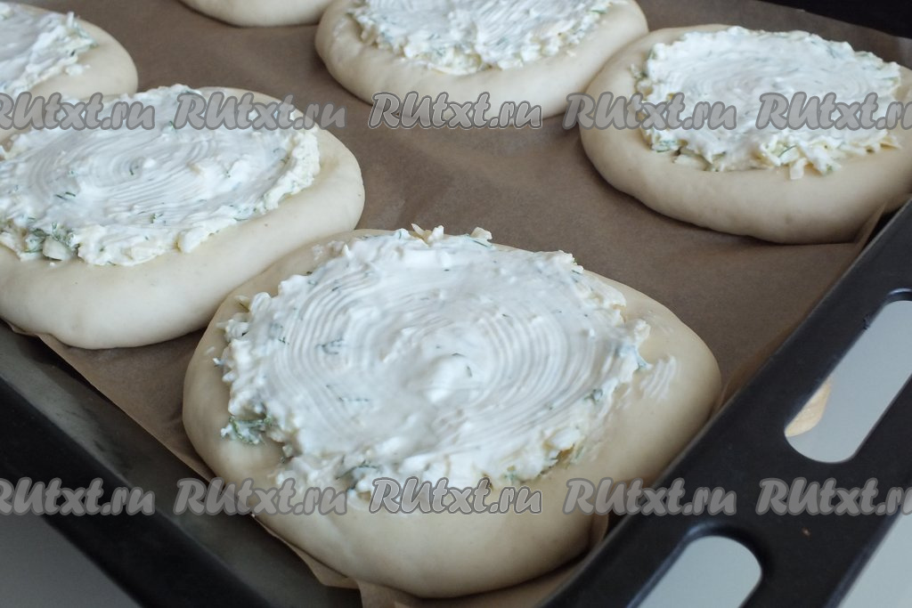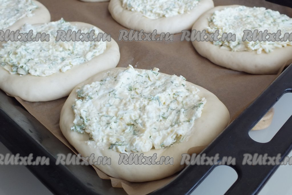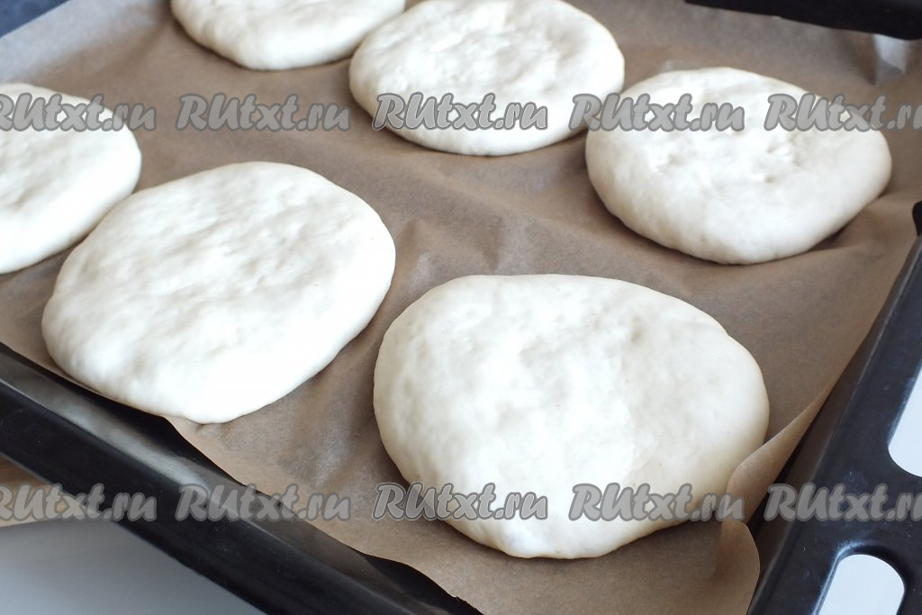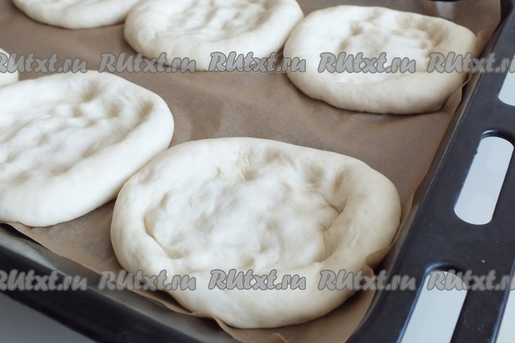 Застелите противень пергаментной бумагой. Каждую заготовку разомните в лепёшку диаметром 12 см. Выложите на противень (лучше выложить лепёшки на некотором расстоянии друг от друга) и оставьте на 15 минут.