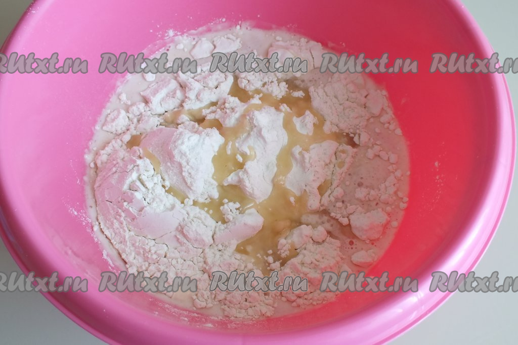 По истечении времени в запенившуюся дрожжевую смесь всыпьте соль, половину указанного количества муки и половину указанного количества масла, перемешайте ложкой. Получится жидкое тесто.
