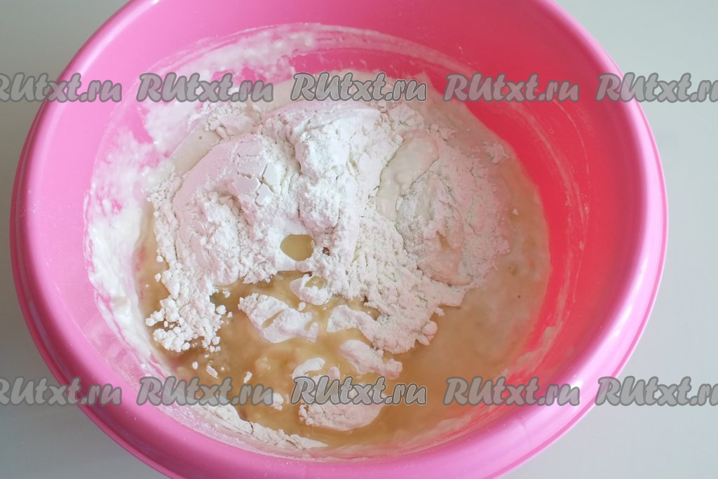 Всыпьте оставшиеся муку и масло, перемешивайте сначала ложкой, когда станет трудно перемешивать, продолжайте замешивать руками.