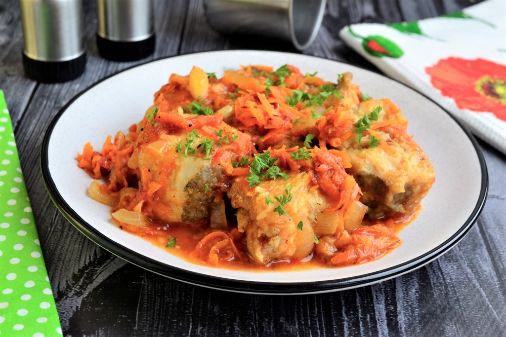 Очень вкусного, нежнейшего хека, тушёного в томатном соусе с морковью и луком, можно подавать к столу с практически любым гарниром.