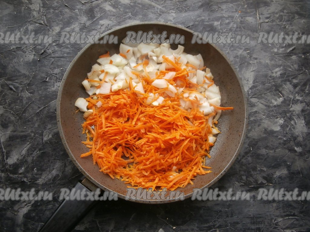 Почистить морковку и лук. 2 столовые ложки растительного масла влить в сковороду, в которой обжаривался хек, сюда же выложить морковку, натёртую на крупной тёрке, добавить нарезанный произвольными кусочками репчатый лук.