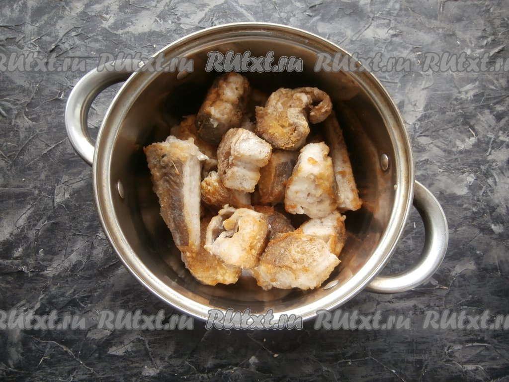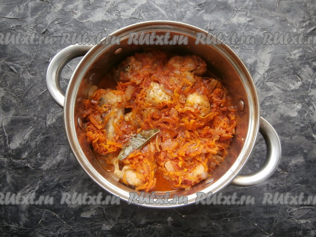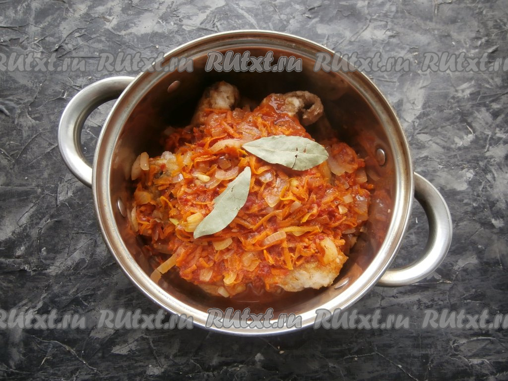 Содержимое сковороды перемешать, влить воду, довести до кипения, а после этого протушить томатный соус на небольшом огне минуты 3-4. Готовый томатный соус перелить в кастрюлю с кусочками хека, добавить лавровые листочки.