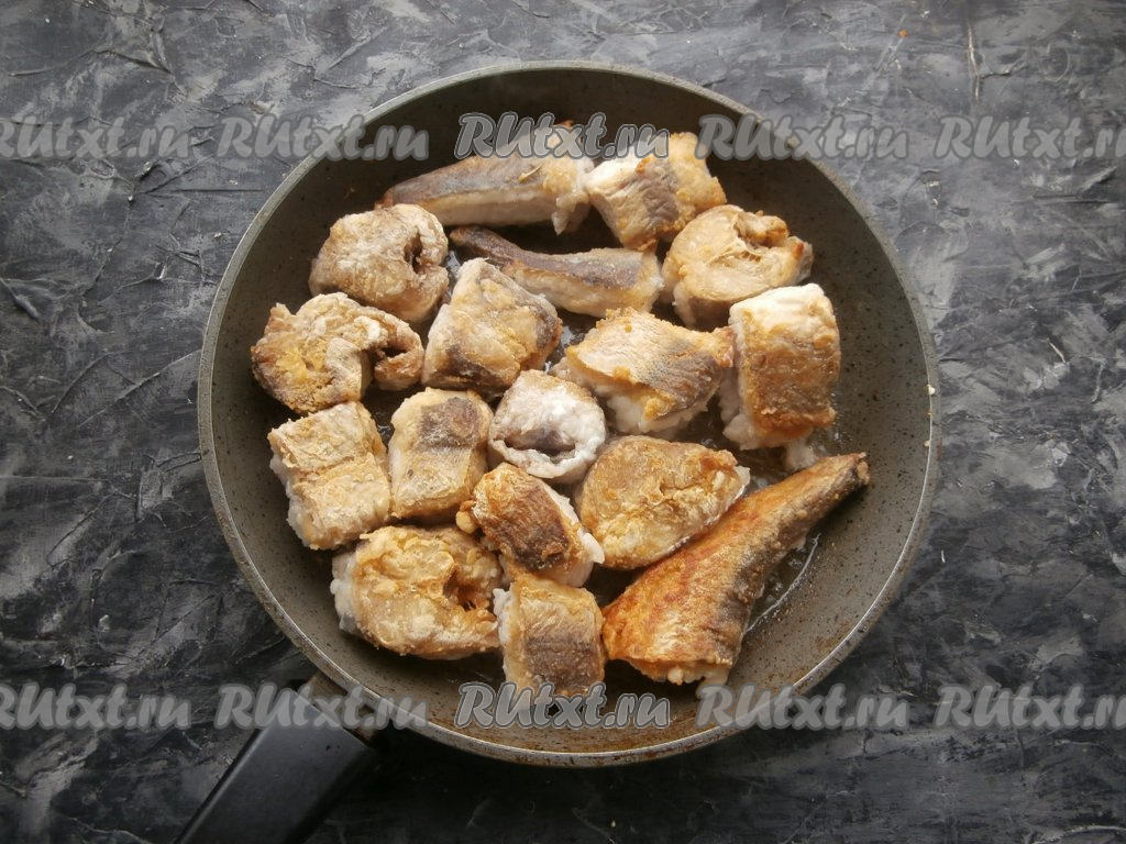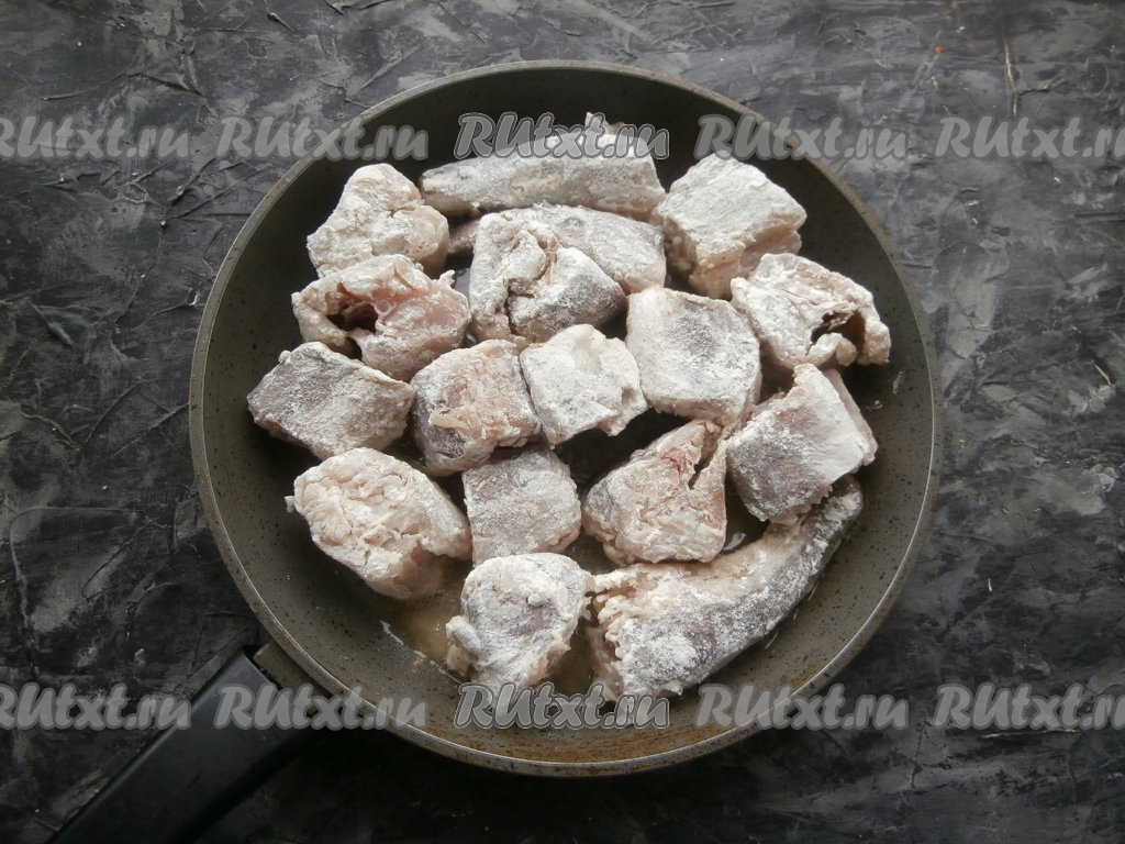 Обвалять каждый кусок рыбы в муке и выложить в разогретую с 3 столовыми ложками растительного масла сковороду.