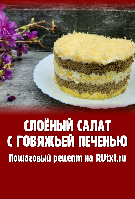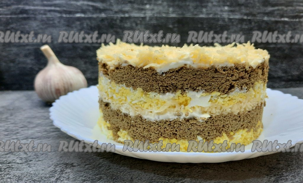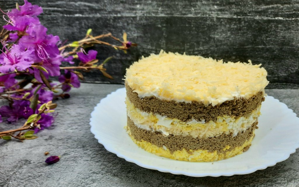 Если вы, как и я, использовали форму, то её нужно аккуратно снять перед подачей. Вкусный, нежнейший слоёный салат с говяжьей печенью готов. Если вы любите блюда с печёнкой, обязательно попробуйте этот замечательный салатик!
