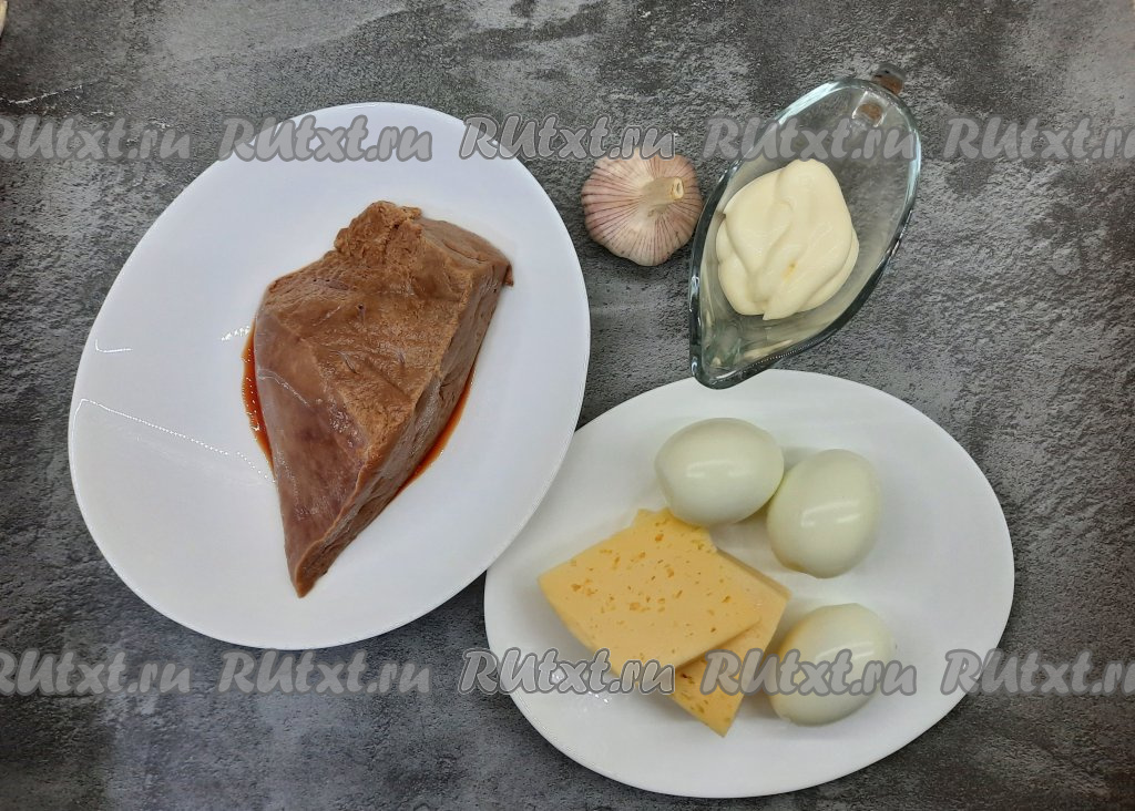 Остывшую варёную говяжью печень тоже натереть в отдельную ёмкость на мелкой тёрке. И яйца, и печёнку, и сыр нужно натирать именно на одной и той же тёрке с мелкими отверстиями, тогда салат получится нежным. Натирать ингредиенты нужно на разные тарелки, потому что блюдо будет выкладываться слоями.