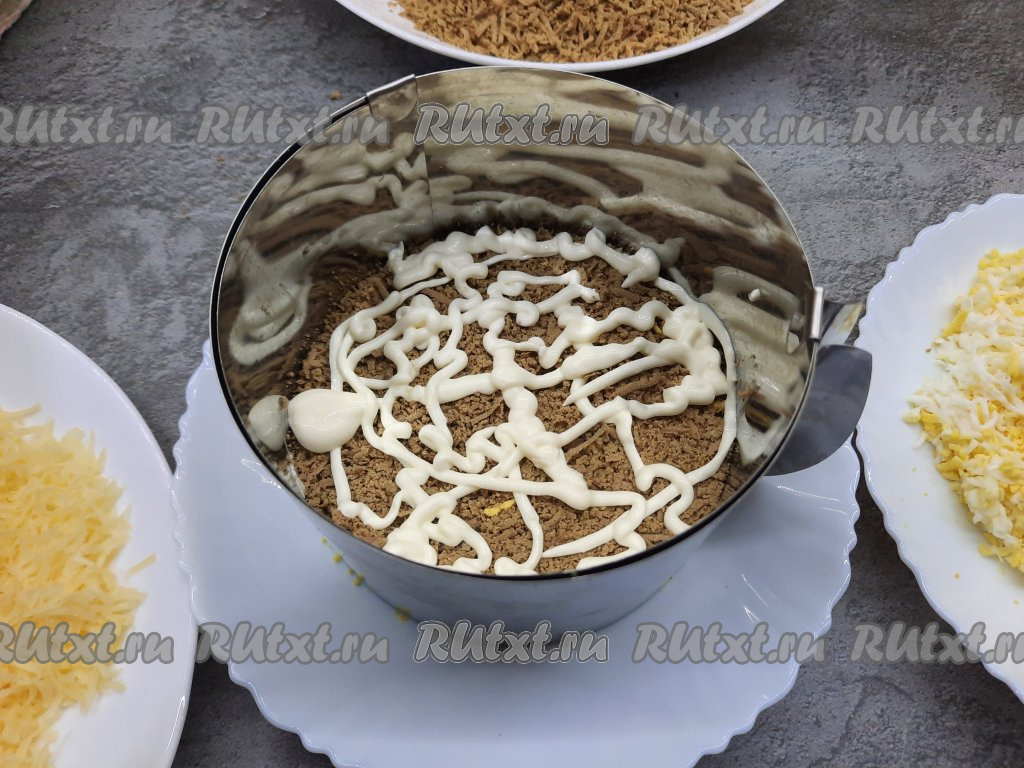 Сверху выложить половину натёртой печени, слегка утрамбовать с помощью ложки, нанести немного смеси майонеза и чеснока.