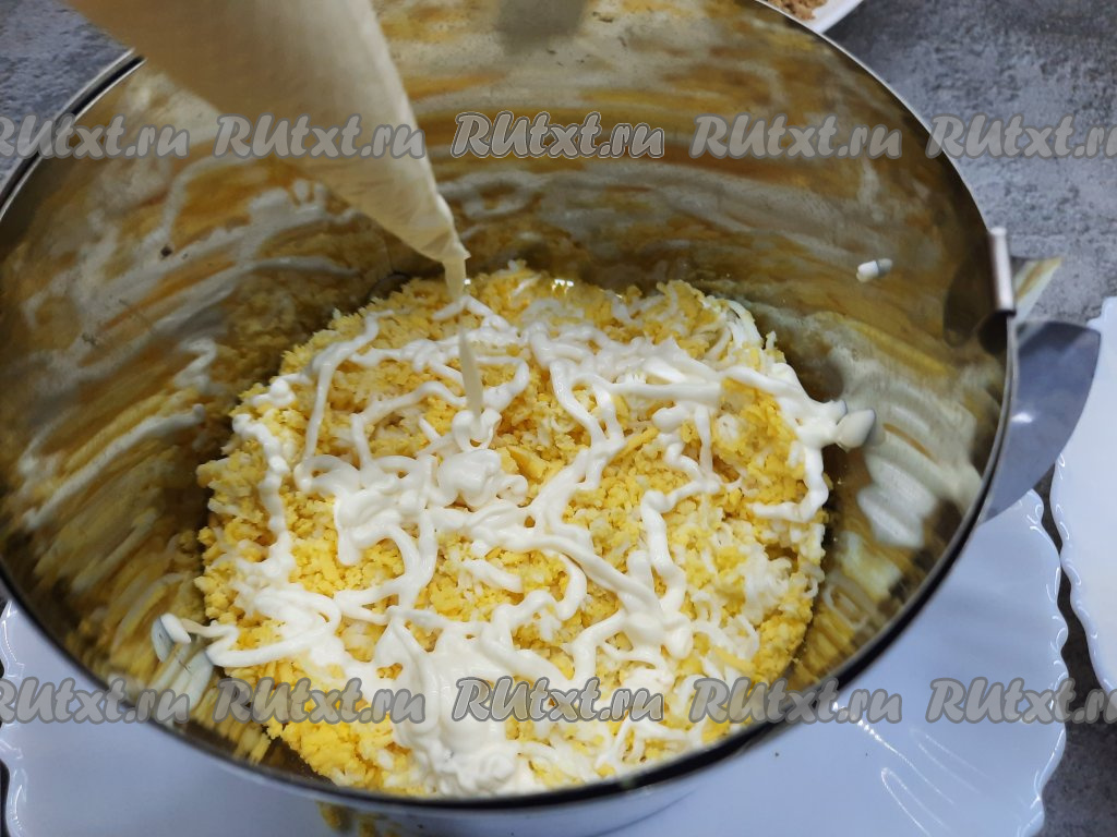 Теперь можно приступать к формированию слоёного салата. Я сформировала салат в разъёмной форме, поставив её на тарелку, можно просто выложить салат слоями в салатник. На дно формы (или салатника) первым слоем нужно выложить половину натёртых яиц, немного примять ложкой, смазать частью майонеза, смешанного с чесноком (для удобства я переложила смесь майонеза с чесноком в кондитерский мешок).