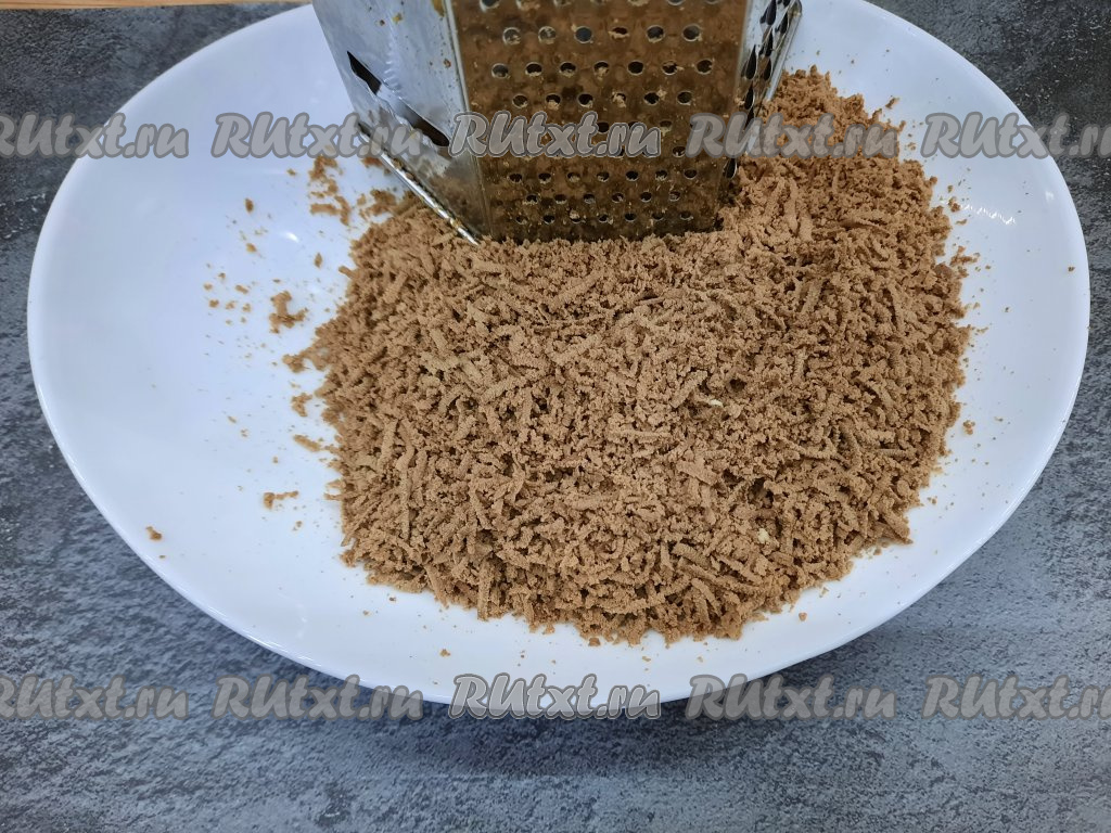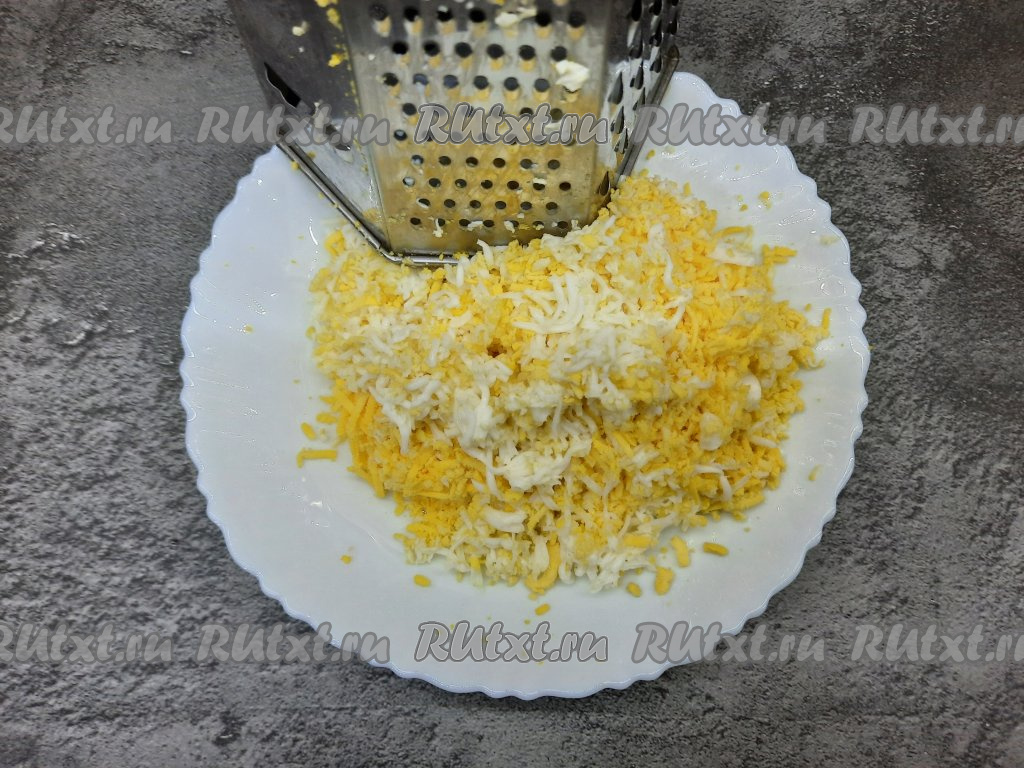 Яйца нужно сварить заранее (варим минут 8-9 с момента закипания воды, затем даём им полностью остыть и очищаем от скорлупы). Варёные яйца натереть в отдельную тарелку на мелкой тёрке.