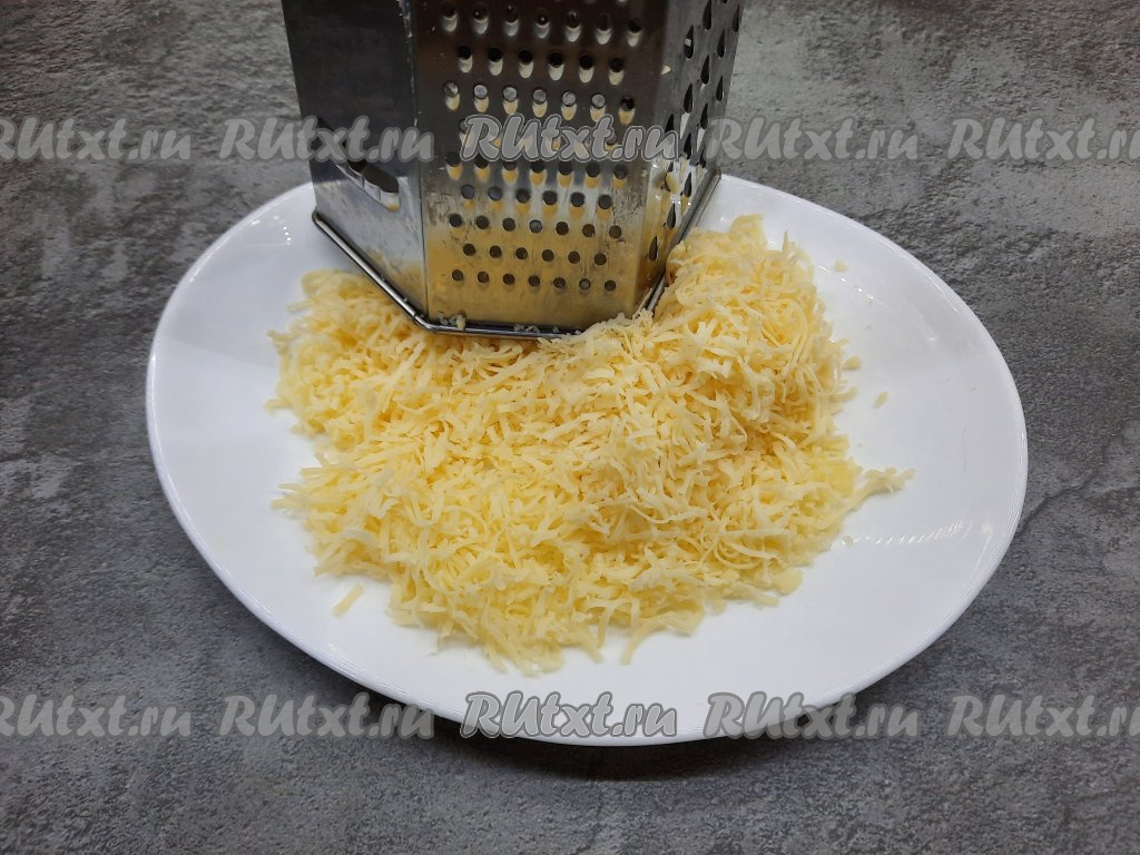 Сыр натереть на тёрке с мелкими отверстиями. Сыр можно брать любой полутвёрдый (у меня "Российский").