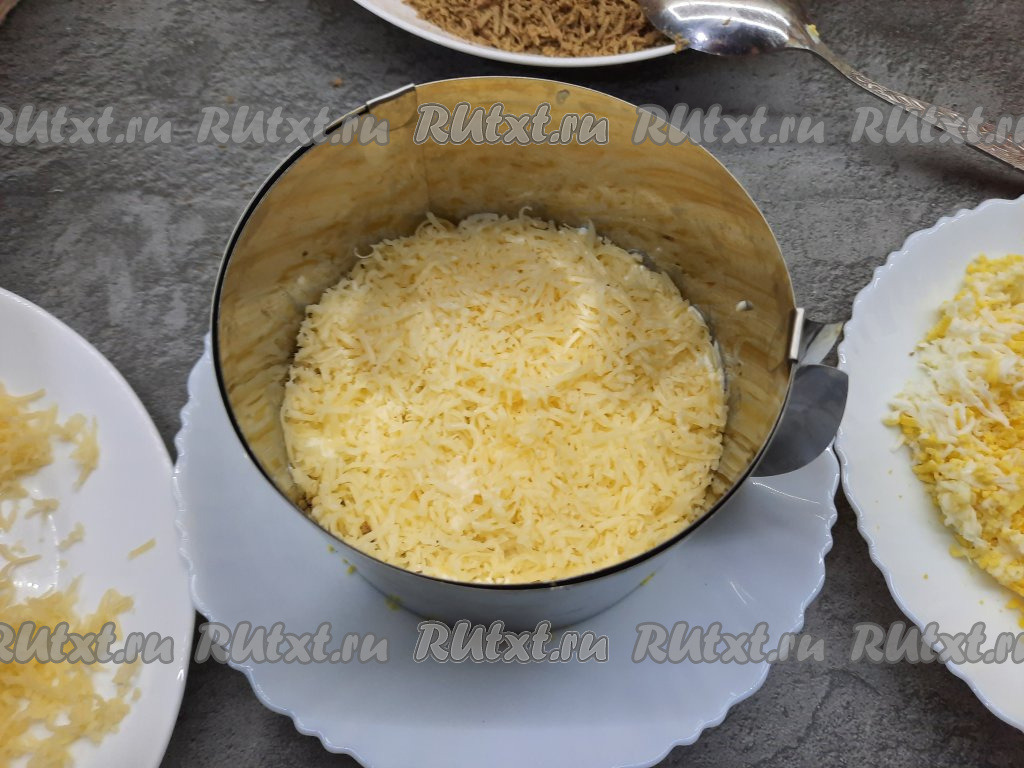 На слой печени с майонезом выложить половину натёртого сыра. Майонез с чесноком на слой сыра наносить не нужно.